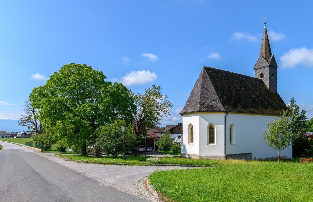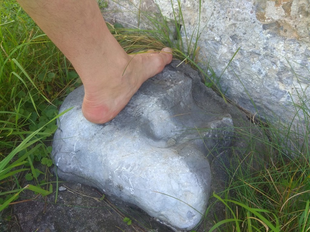 Vor der Kirche, der legendäre Fußabdruck des Hl. Wolfgang im Stein verewigt.